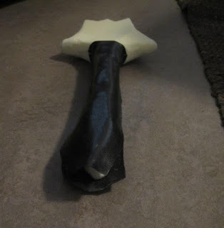 Seuraavassa kuvassa näkyy, että kahvan käsiosa on liimautunut todella kauniisti. Sain sen myös leikauttua nätisti, jolloin päältä maalaus menee varmasti hyvin. Tästä kuvasta näkyy hieman, miten tuo ihan päätyosa vielä repsottaa, koska en vielä tiedä, mitä teen sille. Olen harkinnut, että leikkaan sen nyt ihan finnfoamia vasten ja leikkaan pieniä suikaleita tuonne ylös, jotta saan kaarevuuden ja pyöreyden menemään kunnolla.